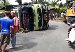 SUKABUMI/86 --- Diduga hilang kendali saat melintasi belokan tajam, truk bermuatan batubara oleng lalu tergu.